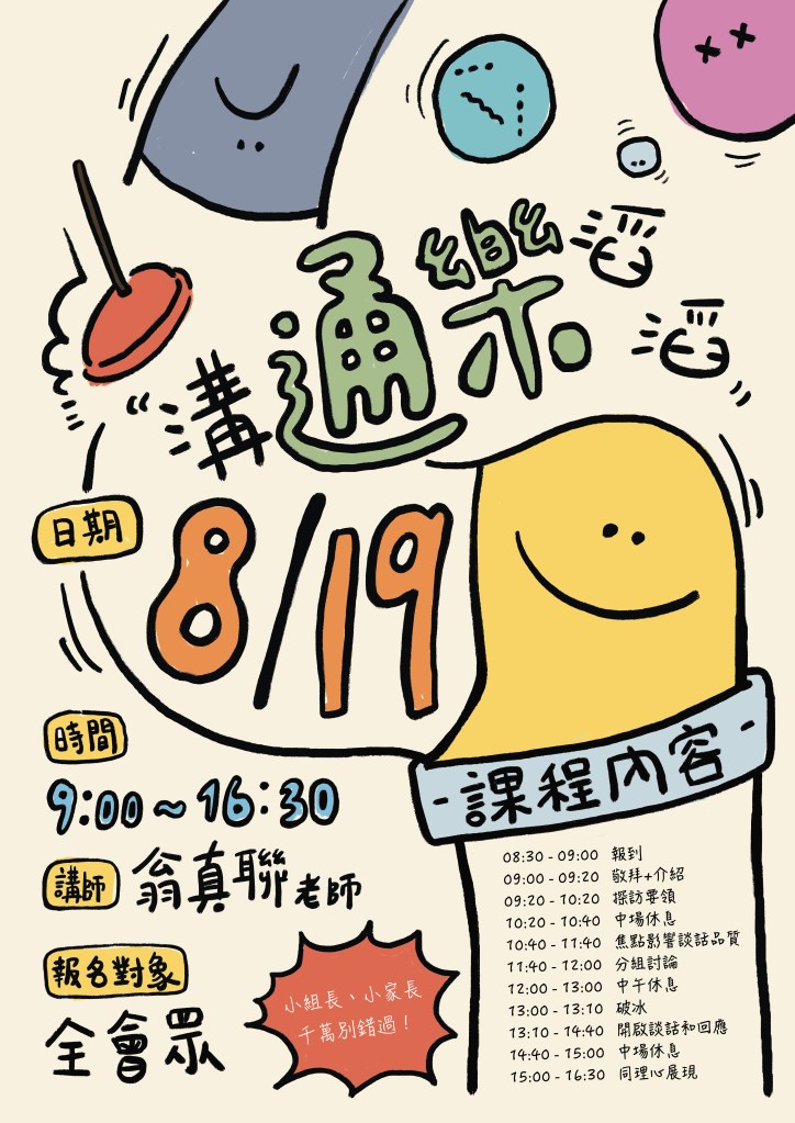 教會活動,活動訊息 溝通樂滔滔 分類: Peace 於 2023-08-022023-09-03 『聊天』是一個說簡單很簡單,說困難挺困難的一件事,如何聊的有內容有品質,透過聊天可以吸收有關對方的資訊(不是八卦),下次可以轉為關懷,這就需要一點技巧了。 翁老師是這方面的專家,不只教你知識還教你實作,透過實作吸收更快更有實質幫助。 立即報名 分享此文: 分享到 X(在新視窗中開啟) X 分享到 Facebook(在新視窗中開啟) Facebook 喜歡 正在載入... 相關